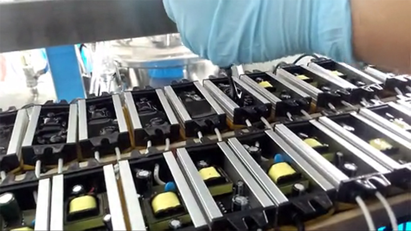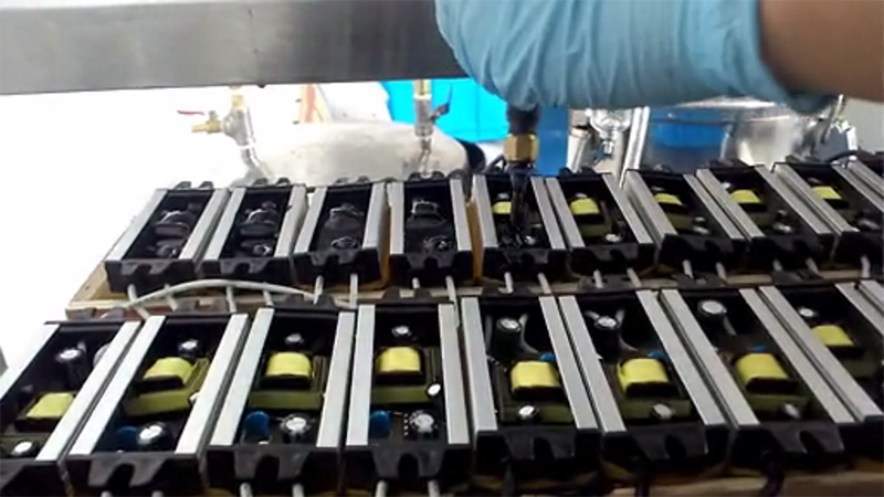 電子灌封膠有雙組份,也有單組份,本案例客戶深圳電子科技有限公司使用我司雙組份電子灌封膠進行電源灌模密封。采用機器進行真空環(huán)境下操作配比,將配比后的電子灌封膠經(jīng)過管道輸出就可以用于電源灌封使用。下面是客戶生產(chǎn)視頻拍攝由于手機拍攝像素問題導(dǎo)致不清晰,請諒解。